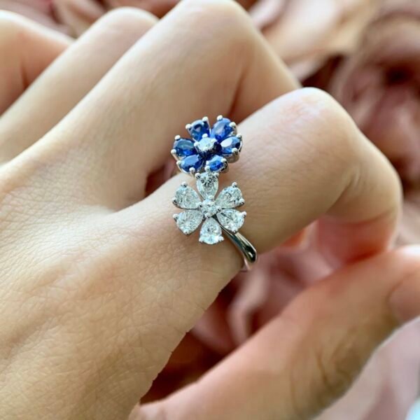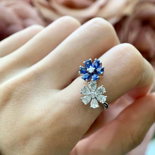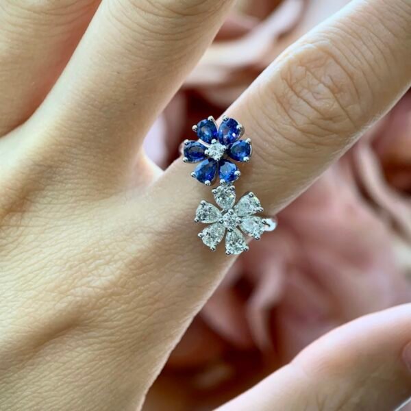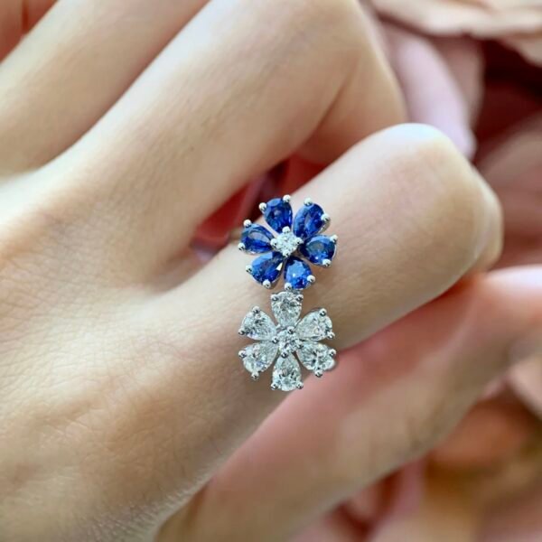 Lab Sapphire and Lab Diamond Daisy Flower Ring – In 18K White Gold